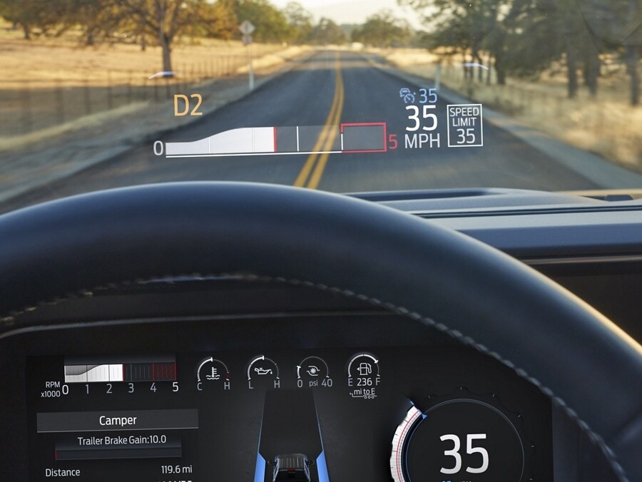 Available Head-Up Display (HUD) helps you keep your eyes fixed firmly on the road while having important information projected onto the windshield in your line of sight without being intrusive, like speed limit, driver-assist details and more. Plus, you can customize the information you see and the location on the windshield.*