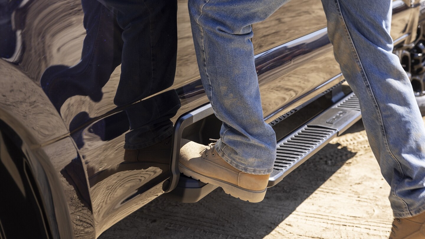 To combat the box side hang over while loading and retrieving items from the truck bed, we fitted work-boot-size steps molded into the box side and rear corner steps integrated into the bumper. Molded hand cups on the top of the box help so you can reach into the bed easily and comfortably.